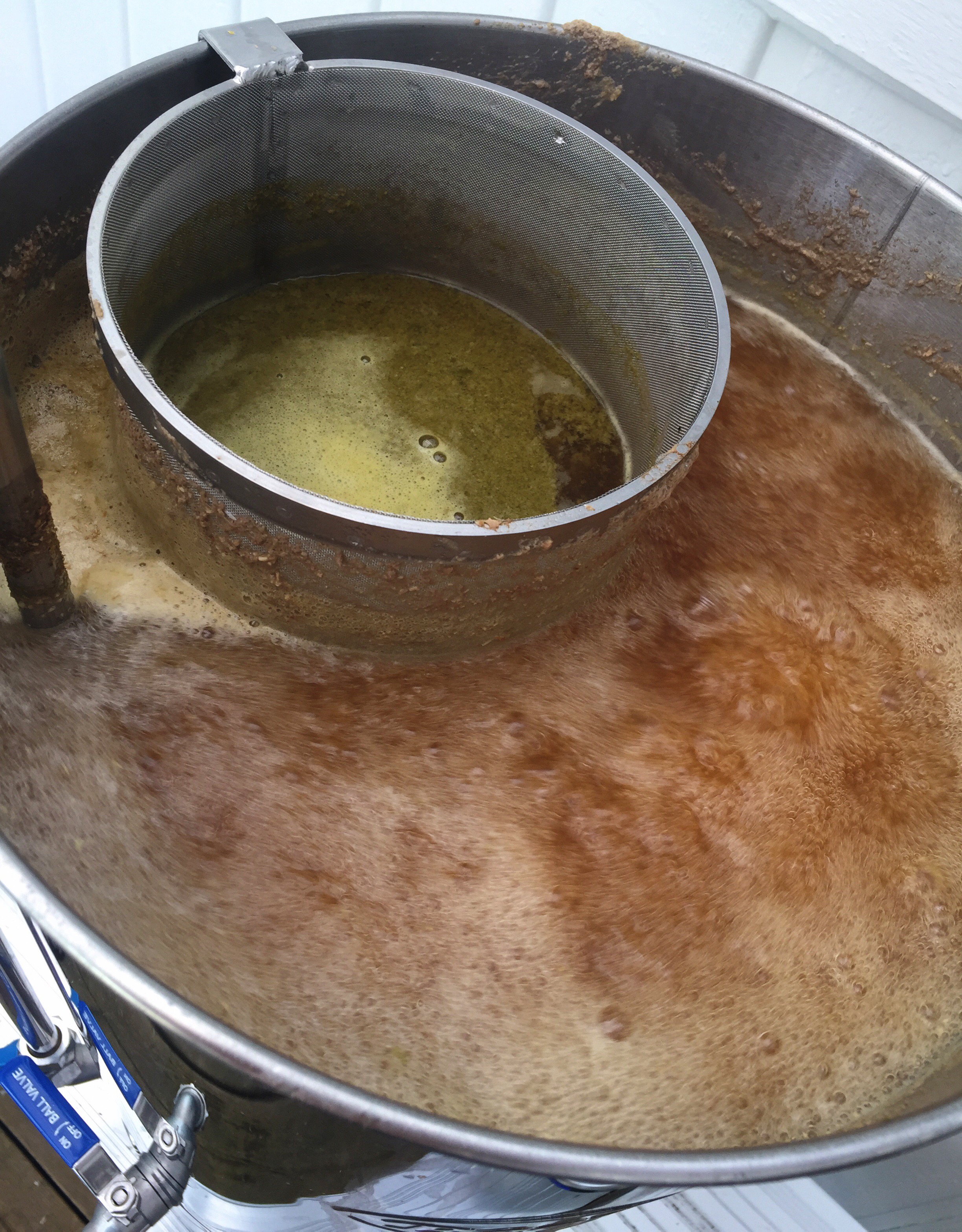 Skyllevann varmes til 77 grader. Etter 90 min mesking slåes pumpa av og programmet for utmesk varmer mesken til 78 grader. Meskekaret løftes, settes på stativ, og det skylles med 14l vann. Oppskriften sier 10-14l. Etter skylling har vi ca 27l til kok. Det tok noe lang tid på å koke opp vørteren. Ved oppkok har vi bitterhumlen i humlefilteret. Det koker nesten over, og det blåses iherdig på overflaten i starten for å bryte skumlokket og forhindre at det koker over. Neste humle etter 45min i humplesokk, og siste etter 59min også i humlesokk. Det er mye humle i humlefilteret så vi rører litt og skraper litt langs sidene på dette underveis i koken da det er tett lag med humle rundt filterveggen og gjennomstrømningen er dårlig.