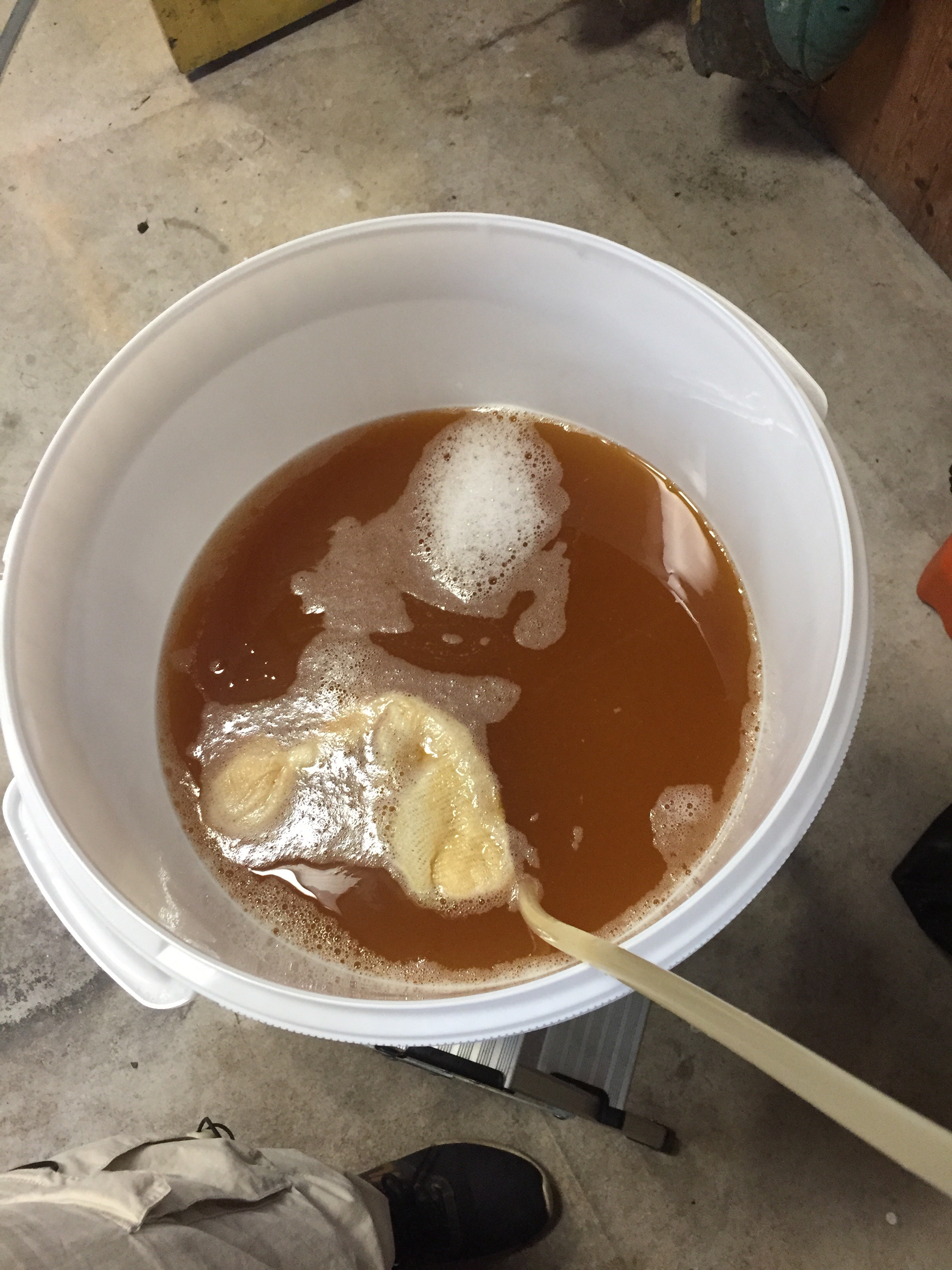 Under (eller før) nedkjølingen gikk pumpa tett. Etter nedkjølingen siles vørteren ned i gjæringskaret gjennom en sil med humlepose oppi. Mye slam, men det er vel bare å forvente av en IPA. 23 liter får vi over i karet. Tørrgjæren has i og vi visper med drillen. Settes i garasjekjelleren.