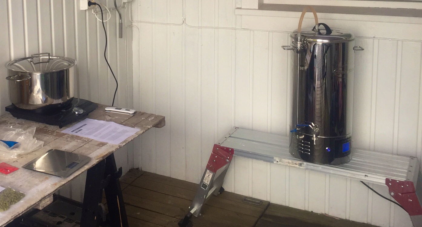 Årets første brygg! I dag var det utrolig deilig å ankomme kvarkebryggeriet og finne fram utstyret i strålende sol etter vinterdvalen. Den største nyheten for årets bryggesesong er at vi har et nytt medlem i bryggegjengen, Herman. Han ligger foreløpig i vogna si og sover. Vi varmet opp endel vann på komfyren inne mens vi rigget til ute på plattingen. Når alt var klart fylte vi bryggeren med 23l vann fra kjelen på komfyren og hageslangen. Vannet var da ca 50 grader når vi startet og vi programerte bryggeren i henhold til bryggeveiledningen.