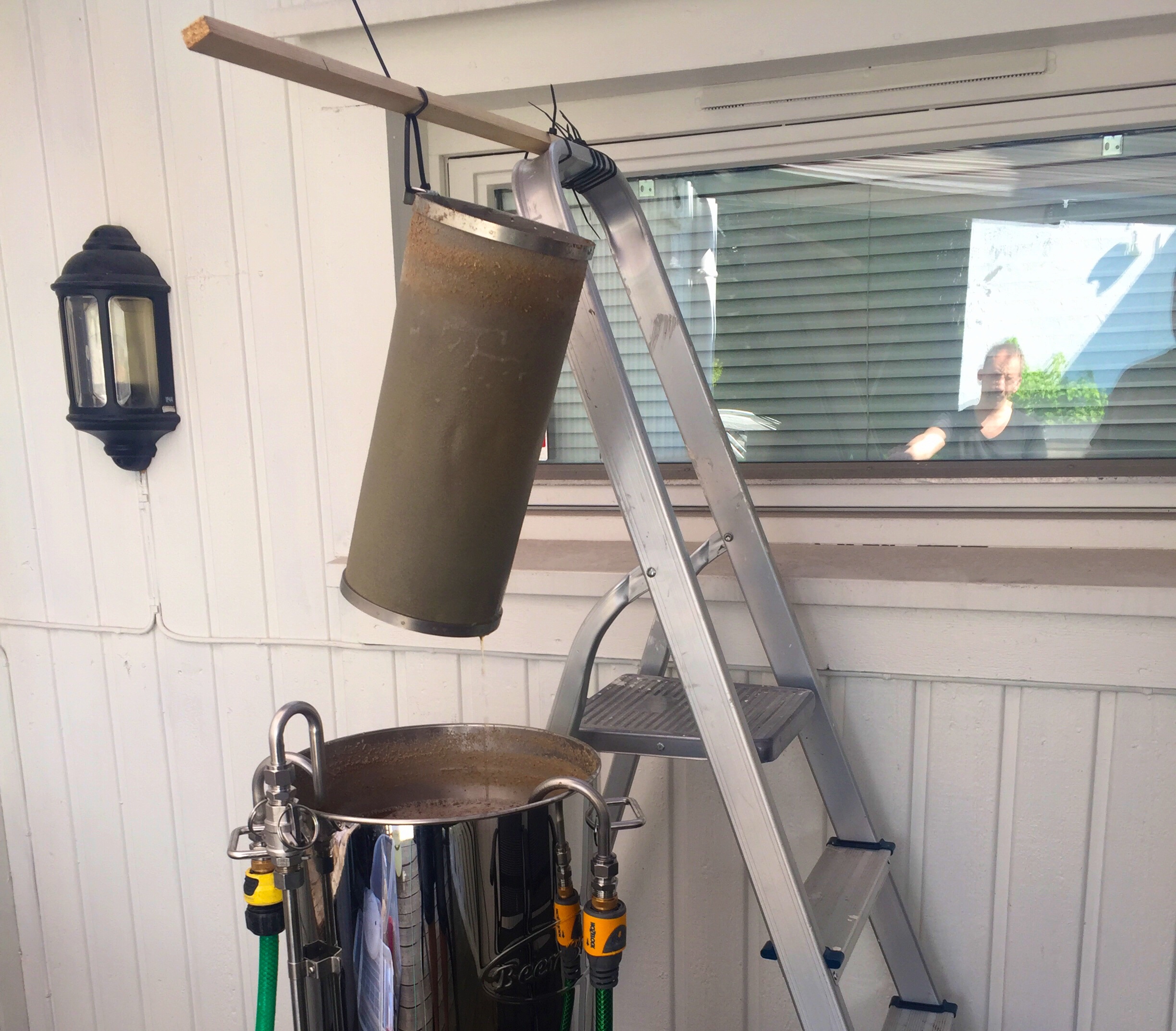 Etter skyllingen varmes vannet opp til kok. Ved oppkok blåses det iherdig på skumlokket for å forhindre at det koker over. Når vi hadde fått kontroll på oppkoket og skumlokket hadde vi oppi 15g humle i humlefilteret.Vi pleier å knote litt med å få ut vørteren som er i humlefilteret siden dette blir ganske tett av humle og metallet er sykt varmt etter kokingen. Derfor laget vi i dag en innretning for å henge opp humlefilteret over bryggeren så det kan renne av seg der.