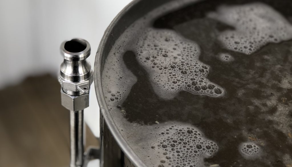 Ved 15min igjen av kok hadde vi oppi humle, koriander, søtt appelsinskall, ferskt sitronskall og protafloc. Da koken var ferdig hadde vi i den siste humla og startet nedkjøling til 13 grader. Tappet over på gjæringsfat gjennom humlesokk og trakt med finmasket filter. Oppi med to pakker tørrgjær og ristet som en gal før vi satt fatet til gjæring på ca 20grader.