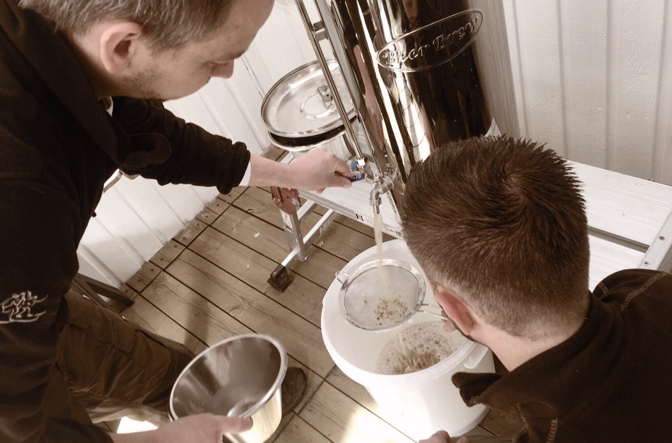 Vi satt på bryggeren til oppvarming av 23 liter vann ca kl 12. Kl 13 har vannet nådd en temperatur på 74 grader og bryggeren piper for å indikere at steget for oppvarming av meskevann er ferdig. Roar heller i maltet og Jan Thore rører ut klumper. Vi satt igang pumpa litt for å få jevn temperatur. Det ble mye skum og for mye vann i maltkurven så det kom endel malt ut av maltkurven. Vi må røre litt i maltkurven for at vannet skal komme ut av den. Nå satt vi på 14 liter vann til skylling på en kokeplate ved siden av. Vannet i maltkurven synker. Vi sirkulerer litt i ca 30sek og sjekker at det ikke renner over maltkurven igjen. Pause. Sirkulerer litt igjen.